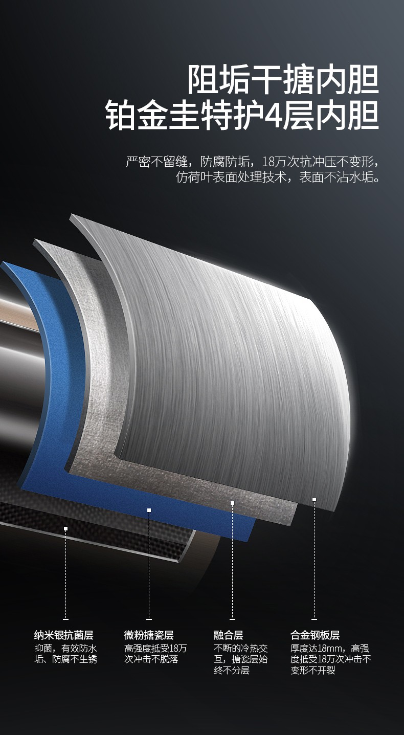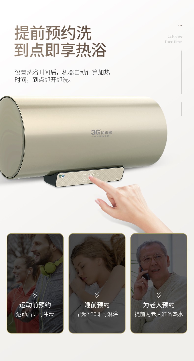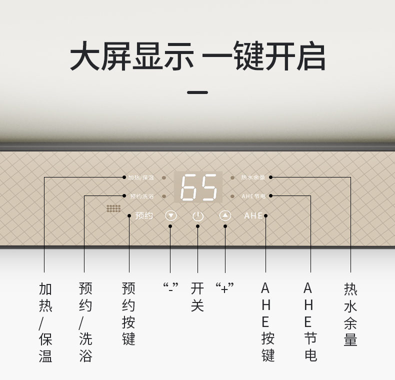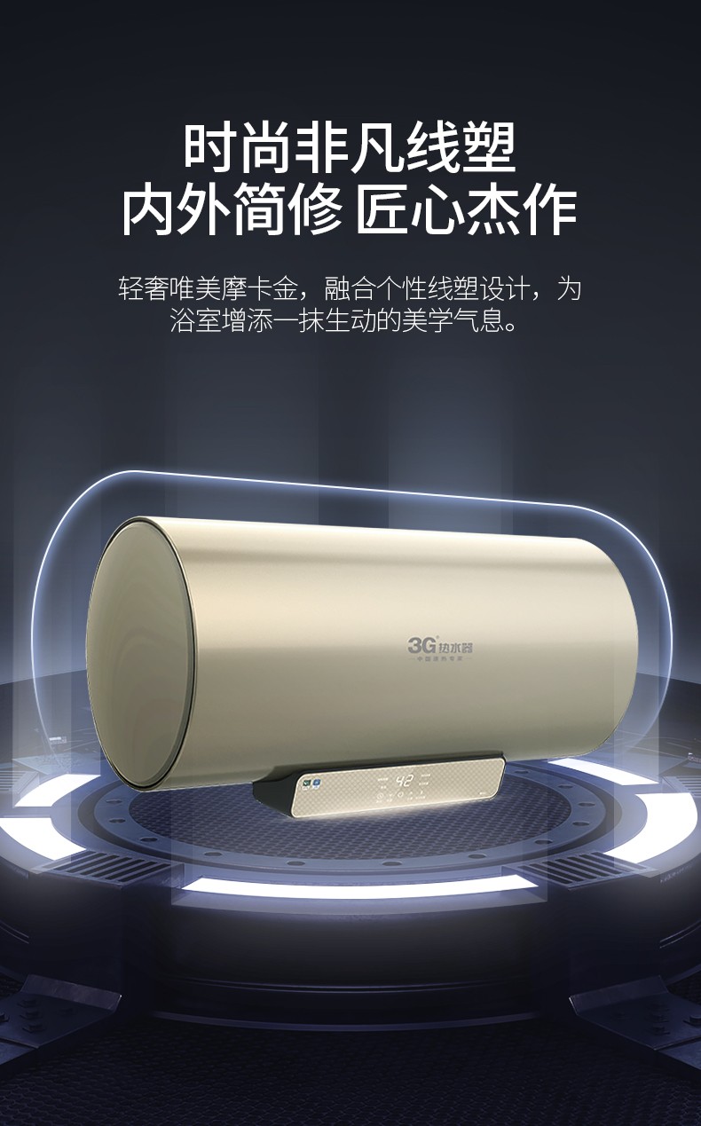 2、時(shí)尚摩卡金,智能預(yù)約,一鍵遙控,告別手觸時(shí)代;雙八數(shù)顯,熱水余量提示。