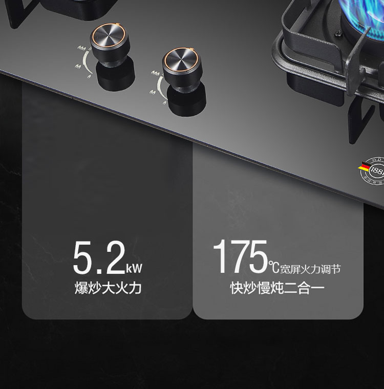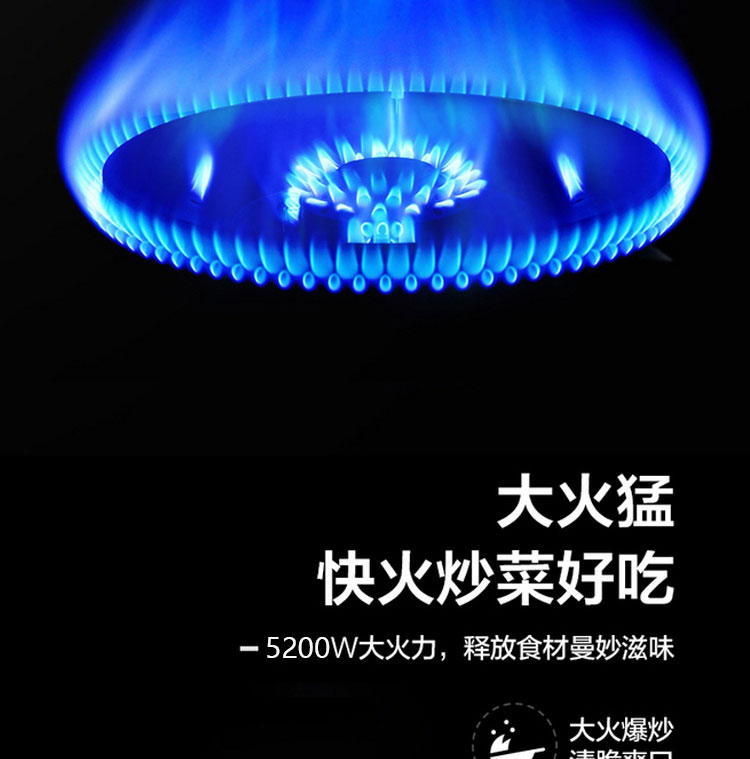 2、5.2KW大火力 :中式爆炒,1級(jí)能效、熱效率63%。
