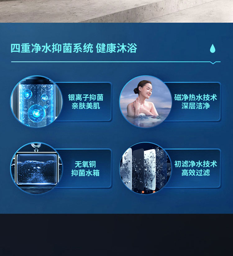 4、四重凈水抑菌系統(tǒng):磁凈熱水、銀離子抑菌等凈水抑菌,抑菌率高達(dá)99.9%。