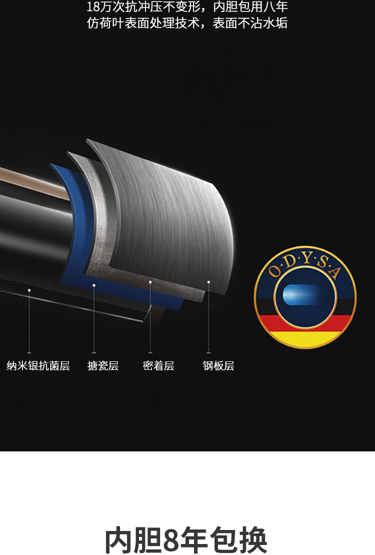 5、德國艾森曼靜電干粉搪瓷內(nèi)膽:內(nèi)膽整機(jī)保用8年。